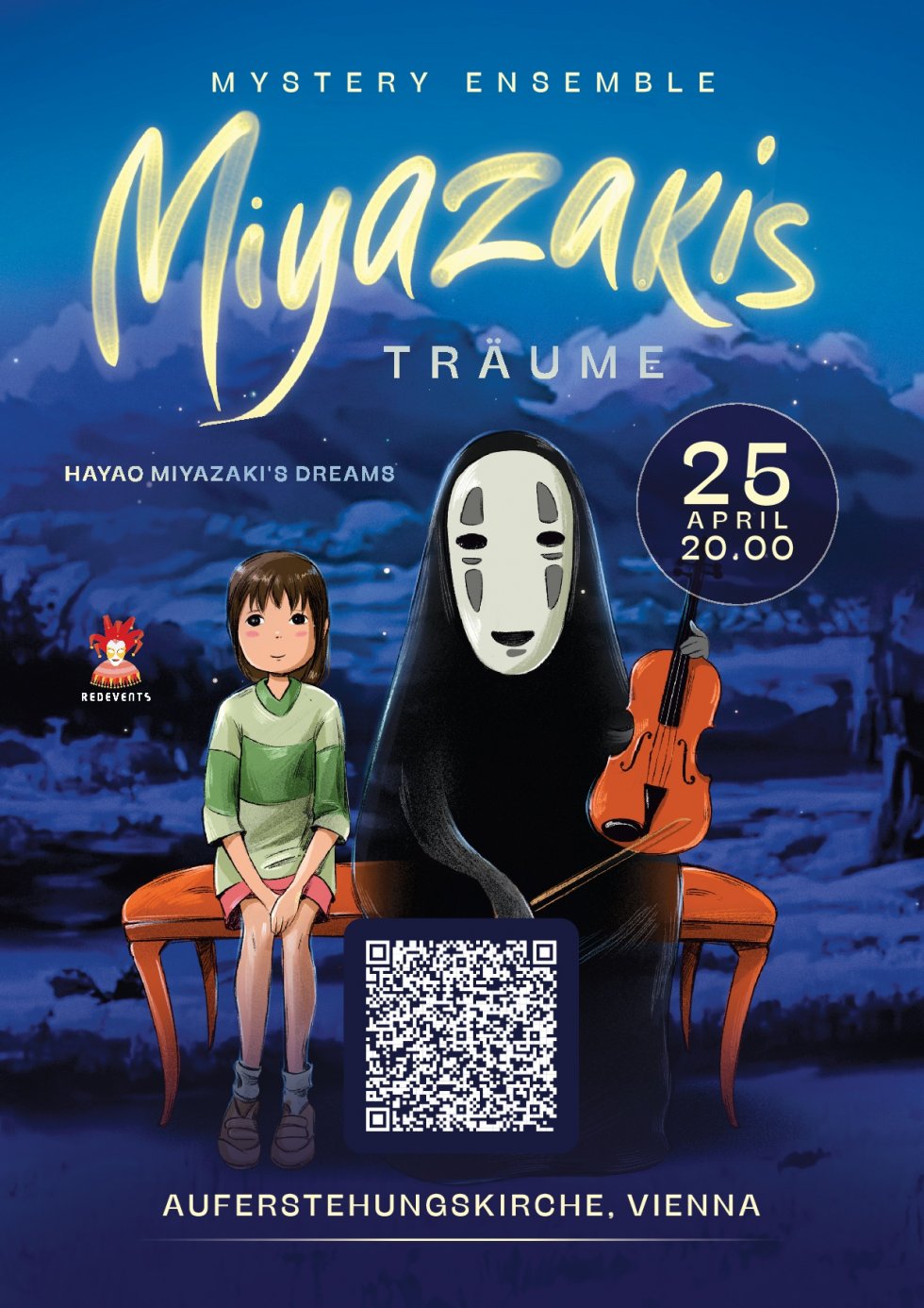 Ein einzigartiges Konzert erwartet Sie am 25. April um 20:00 Uhr in der atmosphärisch einmaligen Auferstehungskirche in Wien. Zu hören sind bezaubernde Soundtracks aus weltberühmten Animes wie „Das wandelnde Schloss“, „Nausicaä aus dem Tal der Winde“, „Chihiros Reise ins Zauberland“ und „Mein Nachbar Totoro“ des größten modernen japanischen Komponisten Joe Hisaishi. Wir laden Sie ein, in die Welt der zauberhaften Musik einzutauchen, untermalt von einer farbenfrohen Darbietung des zeitgenössischen Orchesters Mystery Ensemble. Ein Vergnügen für die ganze Familie ist garantiert.