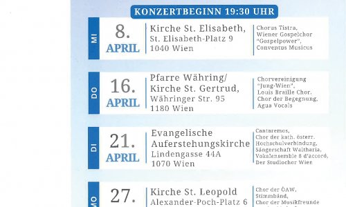 Addresse: AuferstehungskircheLindengasse 44a1070 WienDienstag, 21 April 2026 - 7:30nachmittagsChorfrühling